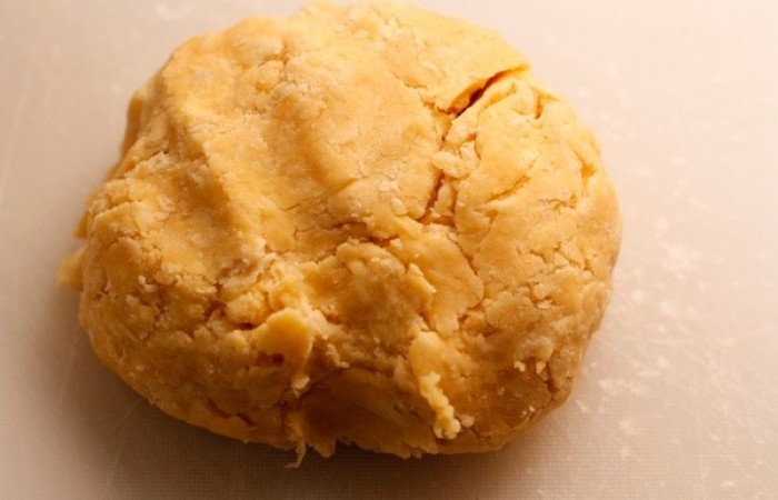 3Замешиваем тесто и формируем из него шар. Накрываем пищевой пленкой и отправляем в холодильник на час.