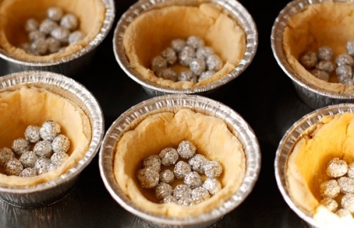 8На дно тарталеток кладем шарики для выпечки или фасоль и отправляем в духовку на 15 минут, предварительно разогретую до 180 градусов. Затем убираем груз и отправляем в духовку еще на 10 минут.