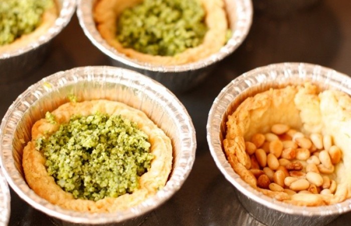 9В тарталетки выкладываем обжаренные орехи, а затем соус песто.