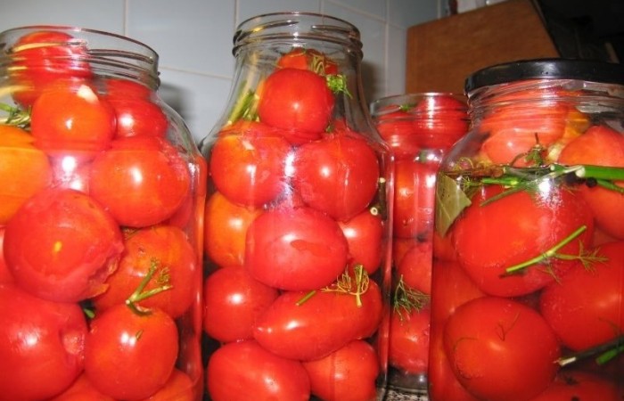 6Заливаем помидоры маринадом (в литр кипящей воды добавляем сахар, соль и уксус и кипятим несколько минут). Закатываем банки и переворачиваем вверх дном. Ставим в прохладное место.