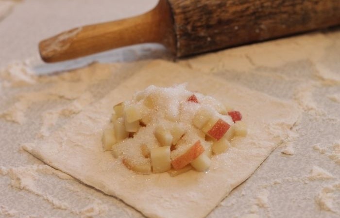 3В центр кладем яблоки и присыпаем их чайной ложкой сахара.