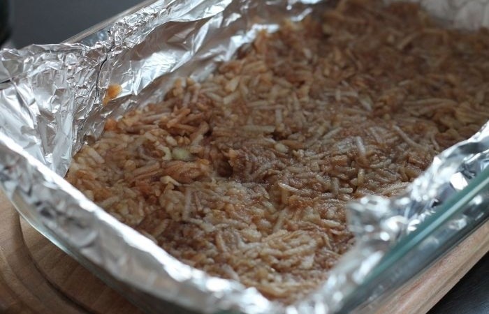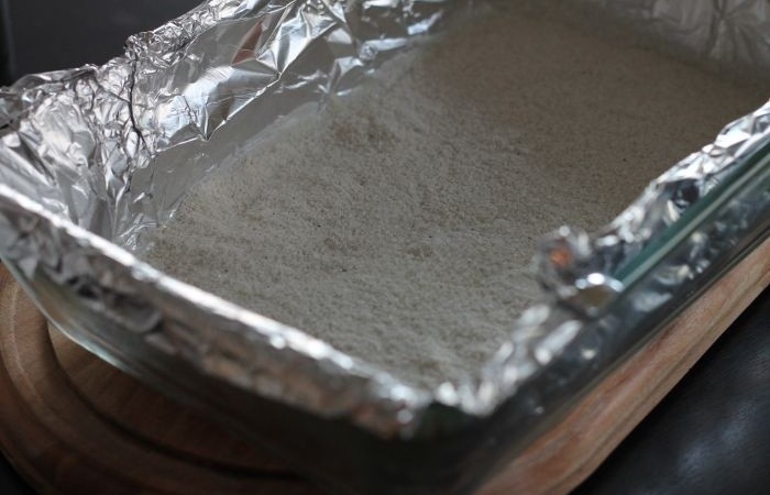 4Форму для выпечки застилаем фольгой или пергаментом. Смазываем кусочком сливочного масла и посыпаем сухой смесью.