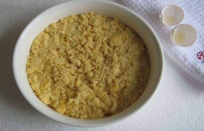 3Охлажденное сливочное масло нарезаем мелкими кусочками и смешиваем с мукой, разрыхлителем и содой. Затем добавляем сахарную пудру с цедрой лимона и рубим тесто ножом до состояния крошки. Также можно растереть тесто и руками. Добавляем желтки, еще раз все перемешиваем и выкладываем тесто в форму для выпечки, смазанную маслом или застеленную пергаментом.