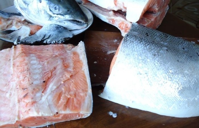 2Рыбку разбираем на кусочки, удаляем кости, плавники и голову. Вообще, можно купить сразу филе семги.
