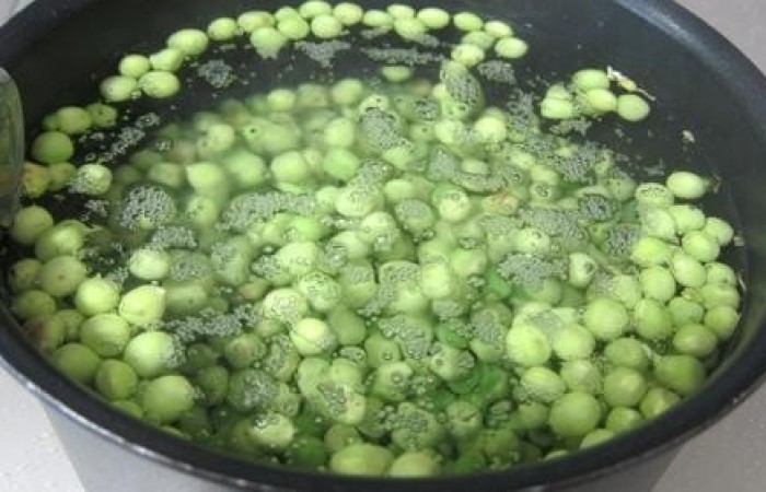 1Горох заливаем кипящей водой и варим около 10-15 минут.