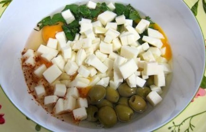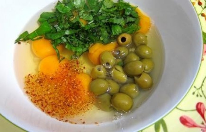 11В отдельной емкости смешиваем яйца, рубленый базилик, оливки и специи. Солим, перчим по вкусу.