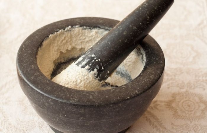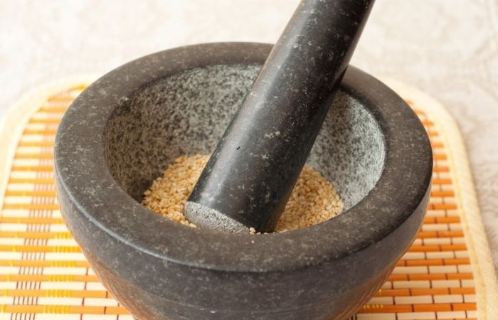 3Выкладываем кунжут в ступку.