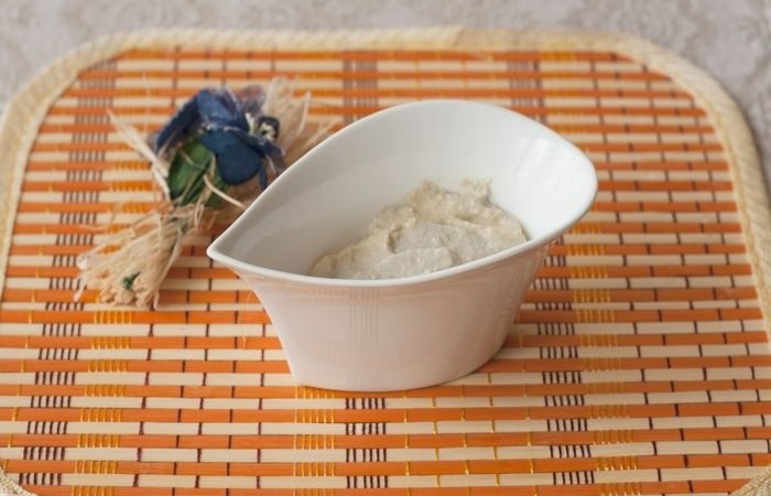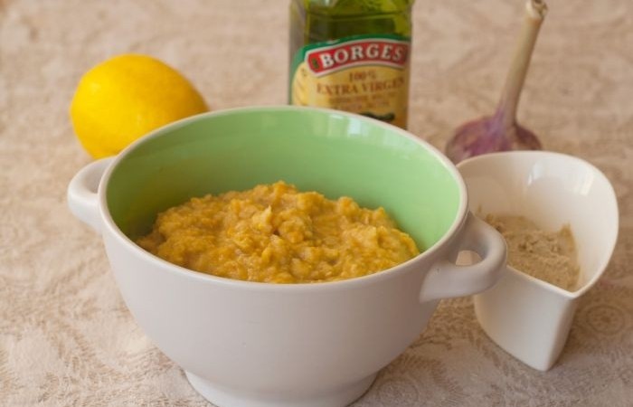 7Измельчаем отварной нут и смешиваем с пропущенным через пресс чесноком, оливковым маслом, лимонным соком и кунжутным маслом.