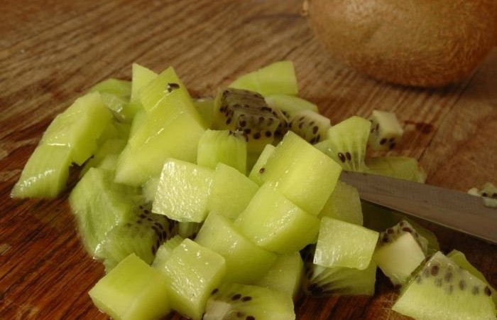 1Киви очищаем от кожуры и нарезаем небольшими кубиками.