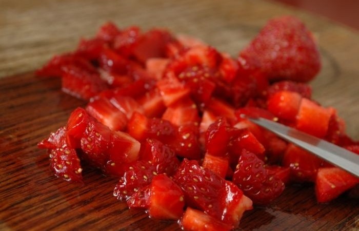 2Клубнику тоже нарезаем небольшими кубиками, предварительно промыв и очистив от плодоножек.
