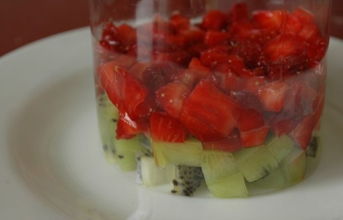 3С помощью кольцевой формы (можно взять просто обрезанную с двух концов бутылку) выкладываем на тарелку киви с клубникой.