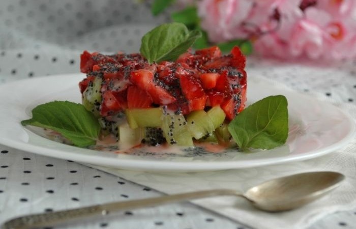 Изысканный салат из клубники и киви - потрясающий витаминный десерт, которым вы с легкостью сможете удивить гостей и близких. Маковая заправка придает лакомству неповторимую вкусовую нотку.