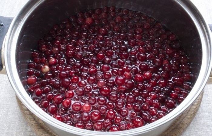 3Доводим смесь до кипения и снимаем с огня. Выкладываем промытую клюкву и оставляем на пару часов.