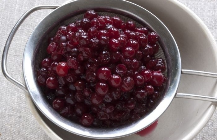 4Провариваем клюкву в течение 10 минут несколько раз. Во время последнего нагревания добавляем лимонный сок. Откидываем ягоды на сито и даем стечь жидкости.