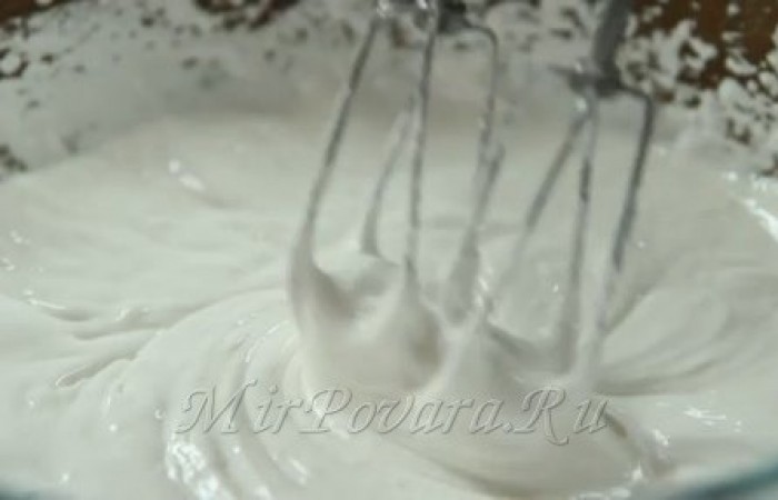 2Белок взбейте миксером или блендером в миске до воздушной пены. Это займет не более 1,5-2 минут. В противном случае, белки станут тяжелыми и осядут. Затем добавьте сахар и взбейте его до полного растворения. А чтобы масса не потеряла форму добавьте в нее свежевыжатый лимонный сок и смешайте до однородной консистенции.