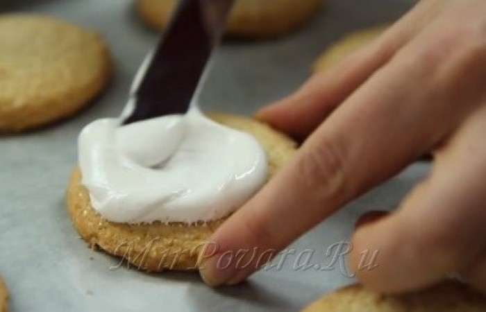 4На каждое печенье распределите приготовленный крем. Не бойтесь запачкать края и нервно распределять массу! Должен получиться эффект тающего снега.
