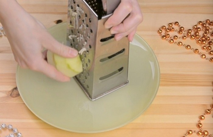 3Яблоко очищаем от кожуры и сердцевины, а затем трем на крупной терке и выкладываем первым слоем в форме петуха на тарелку.