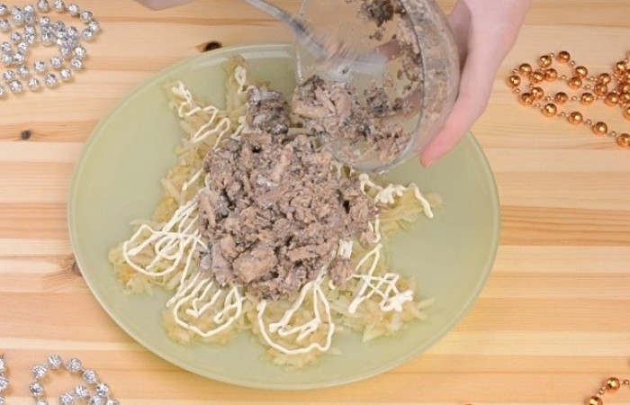 4Делаем майонезную сеточку и выкладываем сайру, предварительно размятую вилкой.
