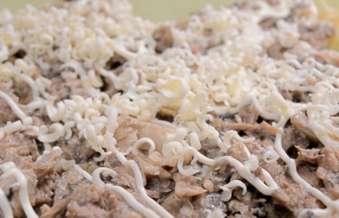 6Затем выкладываем тертое на крупной терке подмороженное сливочное масло и тертый сыр. Опять делаем майонезную сетку.