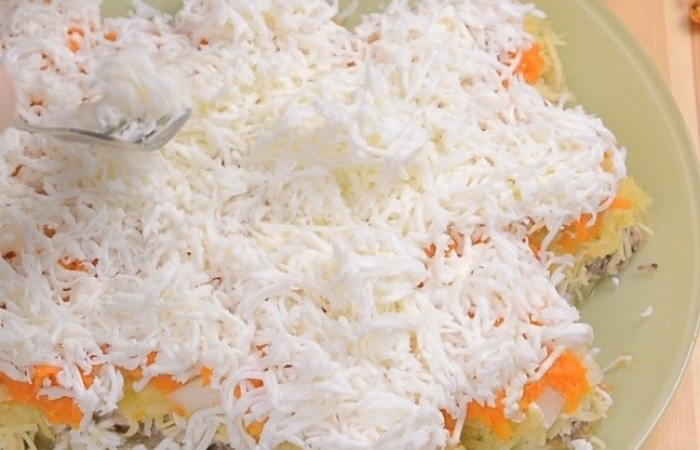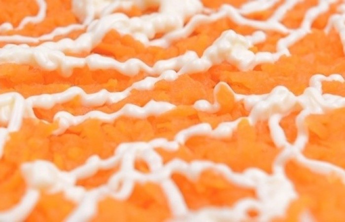 8Далее выкладываем тертую на крупной терке морковь и опять делаем майонезную сеточку.