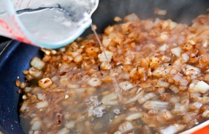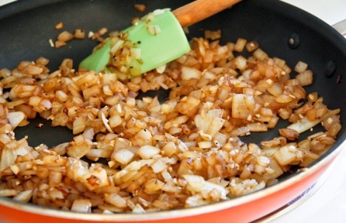 5Обжариваем лук в течение 8-10 минут и добавляем измельченный чеснок.