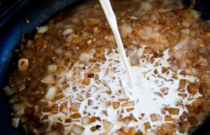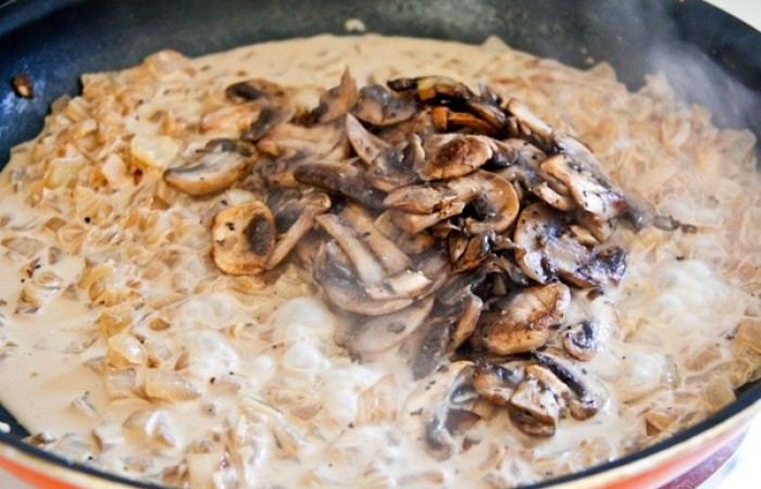 7Далее вливаем сливки. Солим, перчим по вкусу и доводим до кипения.
