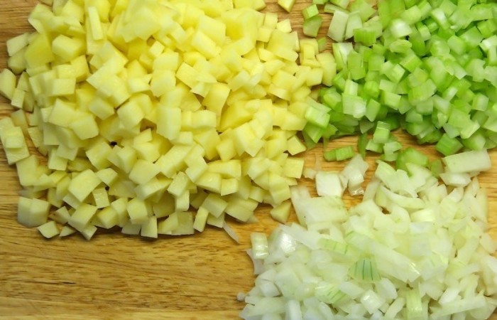2Картофель, лук и сельдерей режем мелкими кубиками.