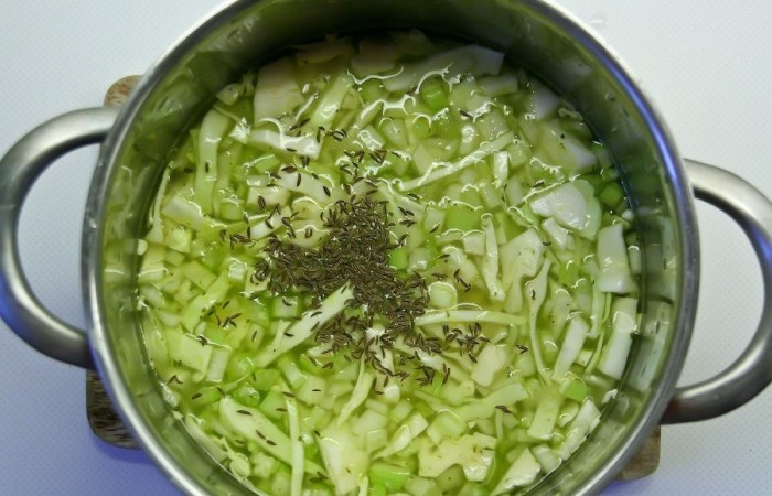 4Выкладываем овощи в кастрюлю, заливаем бульоном или водой и доводим до кипения. Варим 15 минут и добавляем тмин.