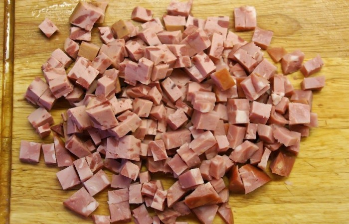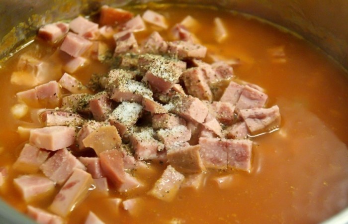 9Добавляем колбасу. Солим, перчим по вкусу. Перемешиваем и варим еще 7 минут.