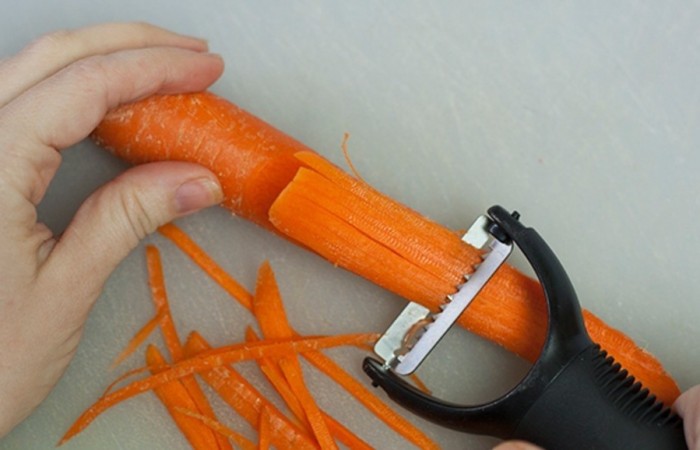 1Морковь нарезаем тонкой соломкой с помощью овощерезки или обычного острого ножа.