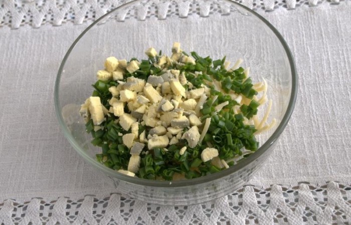 3Затем добавляем нарезанный колечками зеленый лук.