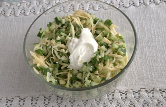 5Затем добавляем нарезанные мелкими кубиками огурцы.
