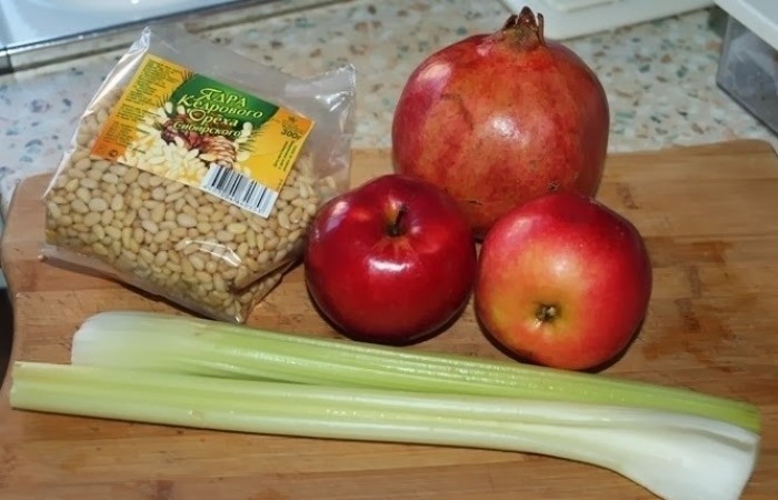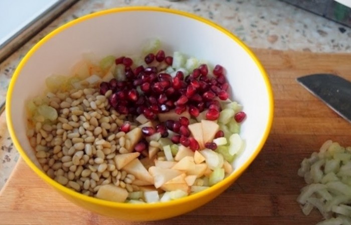 2Сельдерей с яблоками нарезаем мелкими кубиками. Добавляем столовую ложку граната и кедровые орехи.