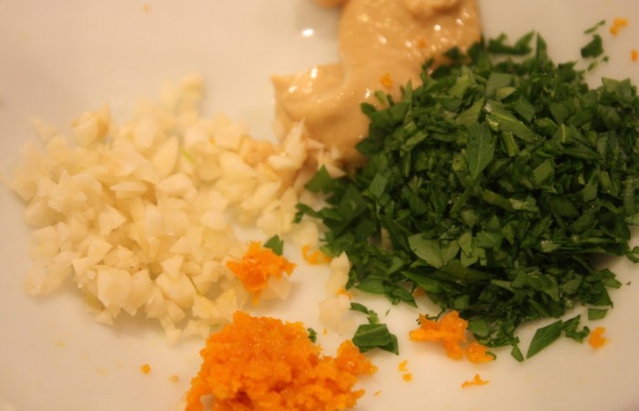 2Тем временем разогреваем масло и обжариваем на нем измельченный имбирь, чеснок и петрушку. Солим, перчим по вкусу. Затем добавляем шампанское, горчицу, а также сок и измельченную цедру двух мандаринов. Перемешиваем, готовим смесь в течение нескольких минут, а затем остужаем.