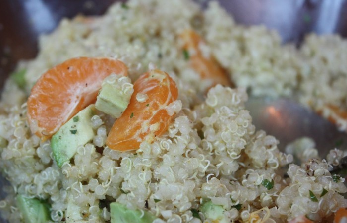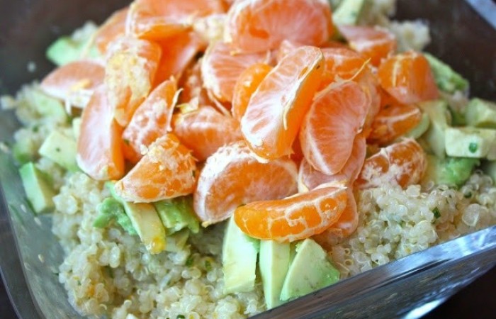 3Получившуюся смесь смешиваем с киноа. Добавляем дольки мандарина, а также кусочки яблока и авокадо.