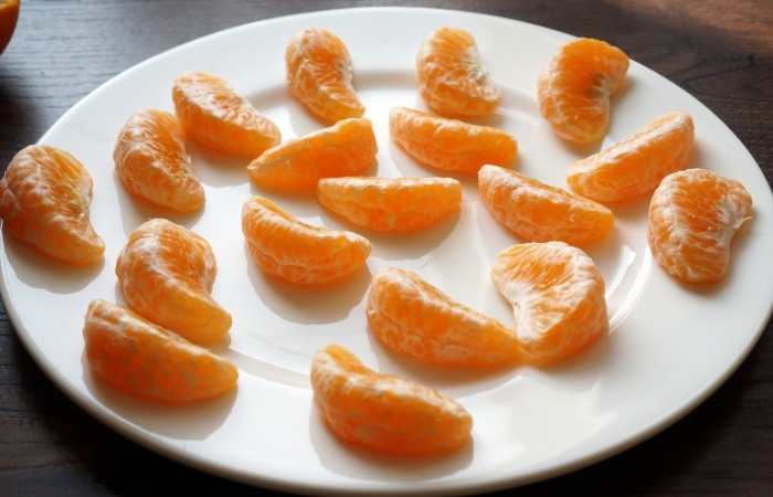2Очищаем мандарины, разделяя их на дольки.