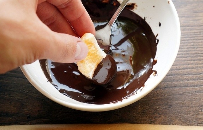 4Каждую мандариновую дольку на половину обмакиваем в шоколад.