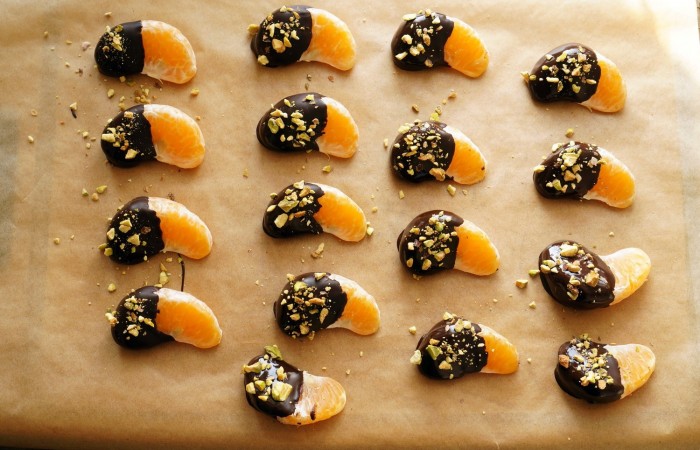 6Посыпаем ими каждый шоколадный кусочек мандарина и оставляем сохнуть.