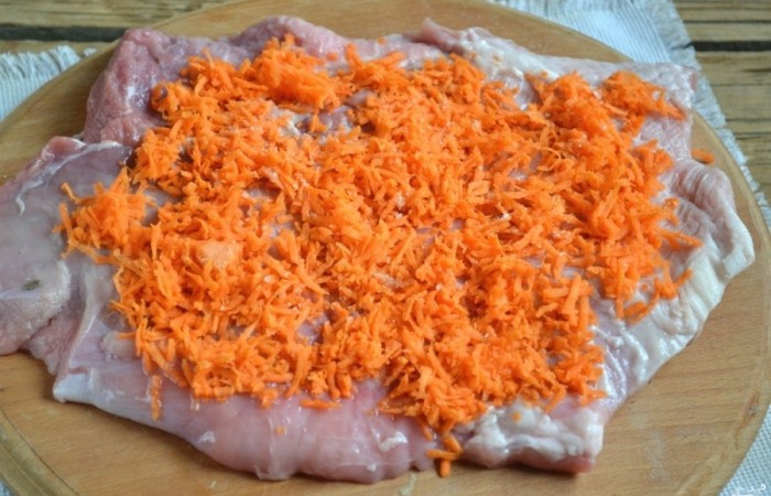 2На пласт свинины выкладываем тертую на мелкой терке морковь. Солим и посыпаем специями.