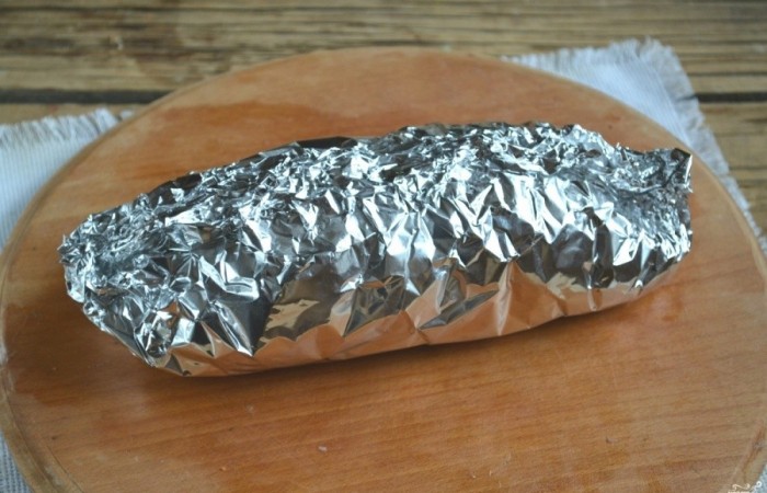 4Рулет заворачиваем в фольгу и оправляем в духовку на 40 минут, предварительно разогретую до 180 градусов. За 10 минут разворачиваем фольгу и отправляем допекаться, чтобы рулетик подрумянился.