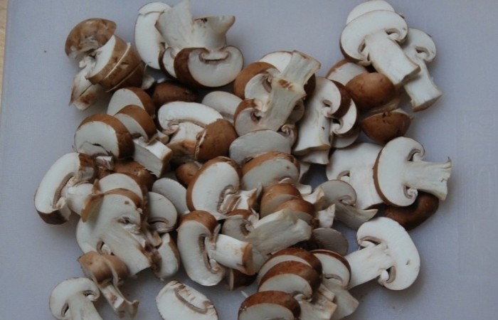 7Тем временем шампиньоны режем пластинами. На раскаленную сковороду наливаем оставшиеся 3 ст.л. масла и выкладываем грибы. Обжариваем грибы в течение 3-4 минут, периодически помешивая.