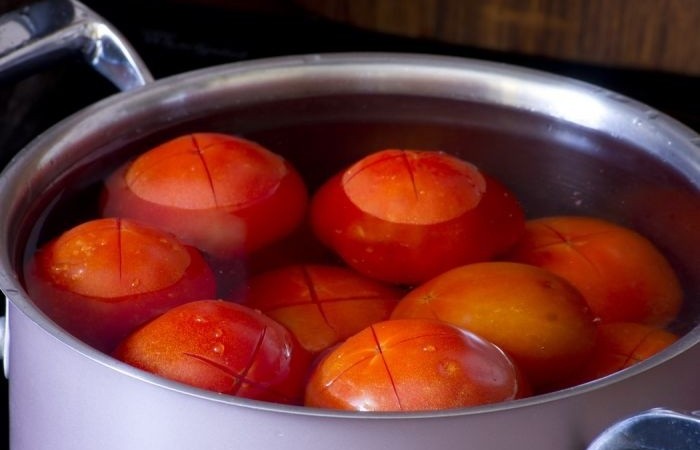 3На помидорах делаем крестообразные надрезы и ошпариваем кипятком на 2-3 минуты. Затем сливаем воду и удаляем кожицу.