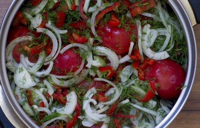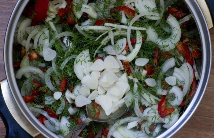 4В глубокую кастрюлю кладем рубленый укроп, нарезанный полукольцами лук и перец соломкой.