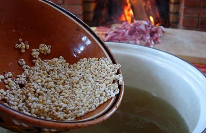 5По истечению времени варки бульона достаем из него овощи (они нам не понадобятся больше) и грудинку. Выкладываем в бульон перловую кашу и желудки. Варим около 20-25 минут.