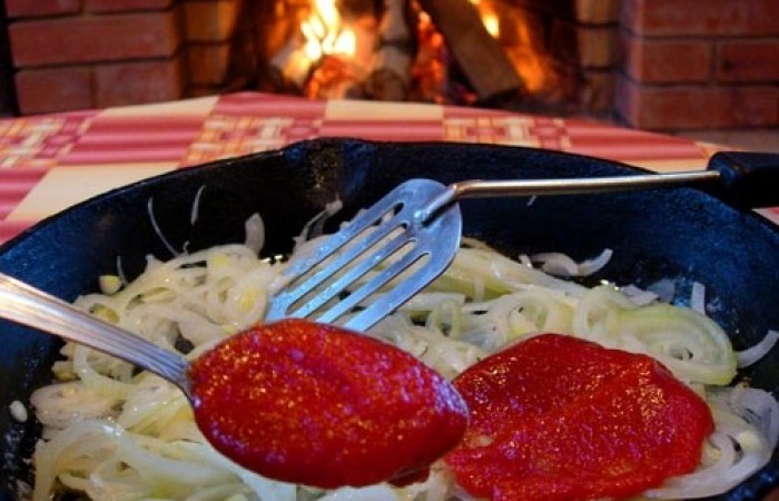 6Тем временем делаем зажарку. Оставшийся лук режем полукольцами и обжариваем на растительном масле около 5 минут. Затем добавляем томатную пасту и тушим около 3 минут.