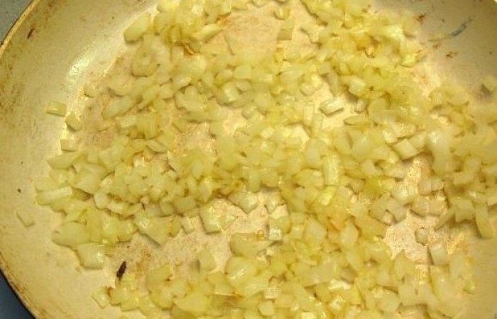 6Разогреваем сковороду и на растительном масле обжариваем лук до мягкости около 5-7 минут.