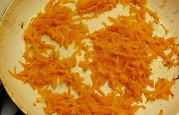 7В отдельной сковороде обжариваем на растительном масле тертую морковь около 10 минут. Можно соединить ее с луком.