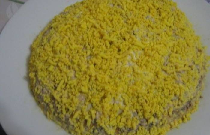 8Салат выкладываем слоями: белки, сыр, майонез, рыба, лук, сливочное масло, майонез. Сверху посыпаем желтками, украшаем зеленью и подаем к столу. Приятного аппетита!
