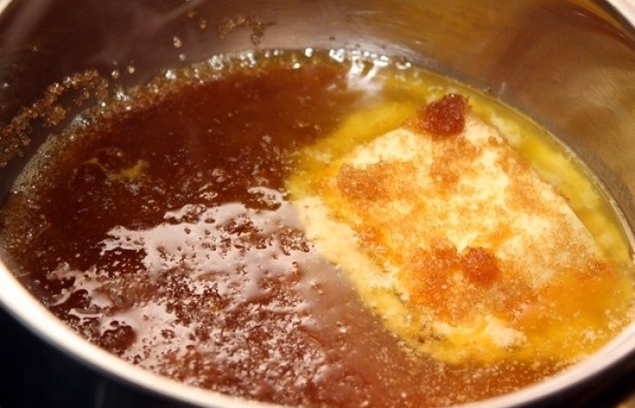 1В кастрюльку выкладываем сливочное масло с сахаром и ставим на огонь. Постоянно помешиваем смесь до состояния однородного сиропа.