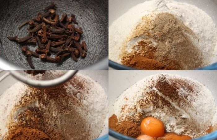 3В отдельной емкости смешиваем корицу, имбирь, кардамон и измельченную в ступке гвоздику. Добавляем муку и желтки.